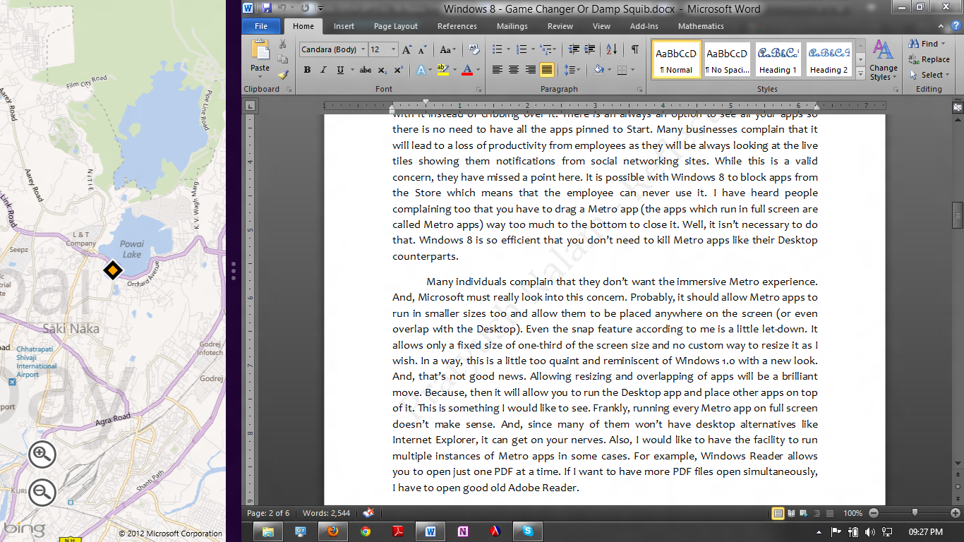 Many individuals complain that they don't want the immersive Metro experience. And Microsoft must really look into this concern. Probably, it should allow Metro apps to run in smaller sizes too and allow them to be placed anywhere on the screen (or even overlap with the Desktop). Even the snap feature according to me is a little let-down. It allows only a fixed size of one-third of the screen size and no custom way to resize it as I wish. In a way, this is a little too quaint and reminiscent of Windows 1.0 with a new look. And that's not good news. Allowing resizing and overlapping of apps will be a brilliant move. Because, then it will allow you to run the Desktop app and place other apps on top of it (like we are used to). This is something I would like to see. Frankly, running every Metro app on full screen doesn't make sense. And, since many of them won't have desktop alternatives like Internet Explorer, it can get on your nerves. Also, I would like to have the facility to run multiple instances of Metro apps in some cases. For example, Windows Reader allows you to open just one PDF at a time. If I want to have more PDF files open simultaneously, I have to open good old Adobe Reader.