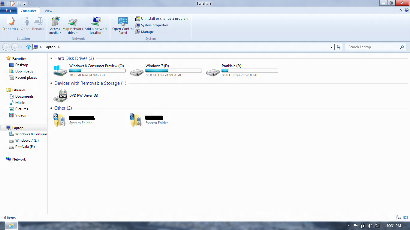 Going to the Desktop, there are three major improvements here. The first is the inclusion of the Ribbon in Windows Explorer. The Ribbon which is present in Microsoft Office is one of the most amazing things developed by Microsoft and seeing it in Windows Explorer was gratifying. It makes life much easier as commands are neatly grouped together and it is a fantastic job put together. Even the "Up" button is back!